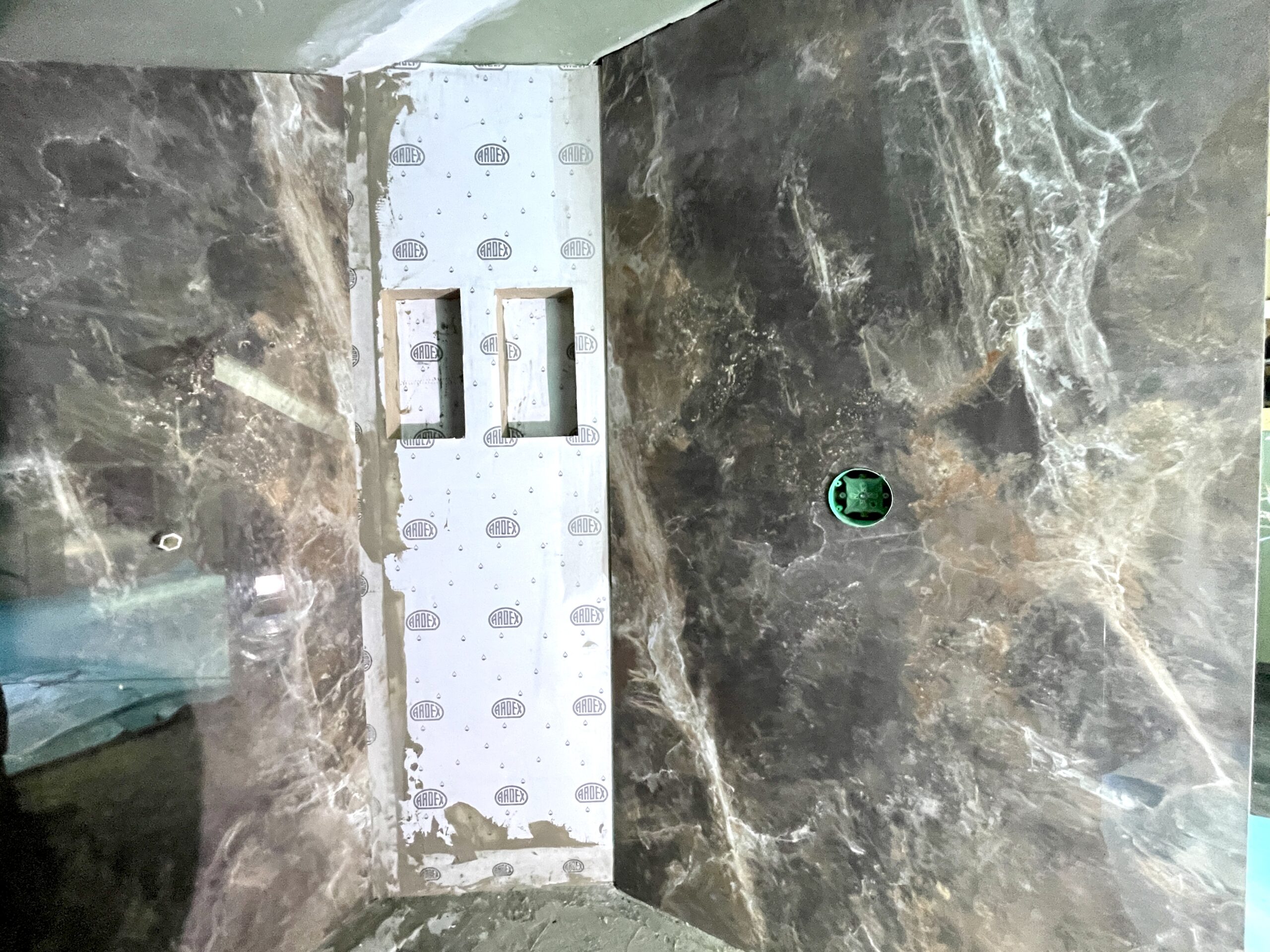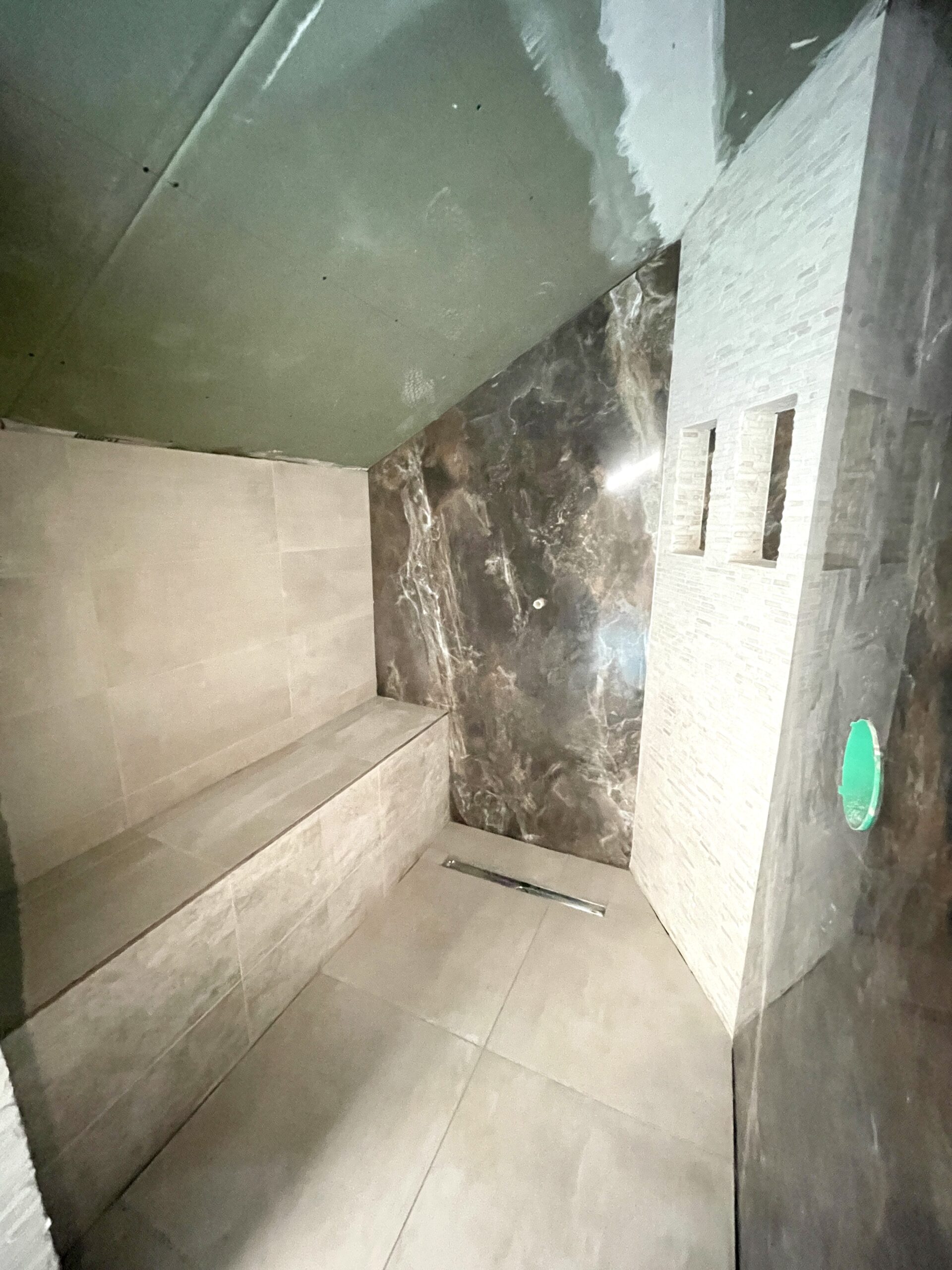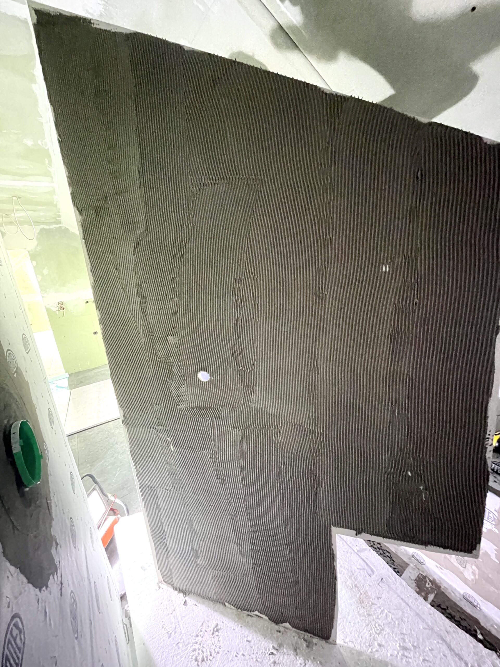 Damit ein Bad in XXL-Optik erstrahlen kann, braucht es höhere Ansprüche an den Untergrund. Schließlich möchten wir langlebige und mangelfreie Arbeiten abliefern. Nicht jeder Untergrund eignet sich somit für alle Fliesenformate. Der Untergrund sollte besonders eben sein und keine Hohllagen oder Kantenversatz aufweisen. Ebenfalls muss er ausreichend tragfähig und stabil sein, denn große Fliesen haben ordentlich Gewicht. Ist dies von der Bausubstanz her nicht gegeben, müssen wir nacharbeiten.